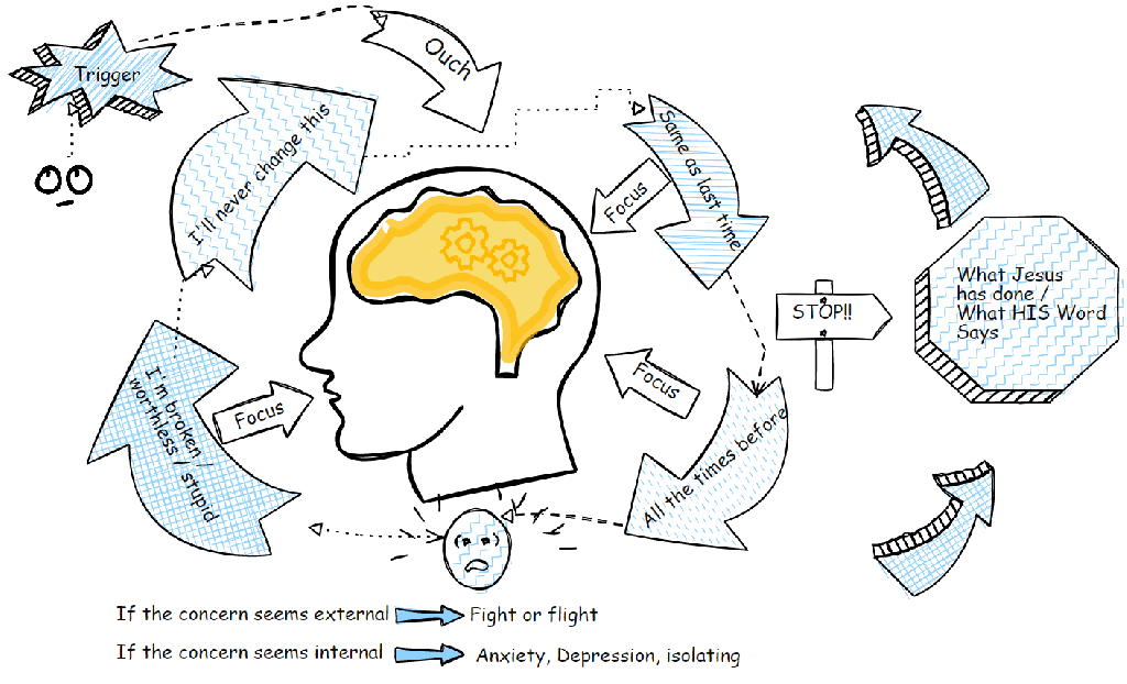 From our chart, we can see that God would have us stop the thought cycle early. We may register the hurtful thought. We may notice the behavior or words spoken to us. However, by taking those thoughts captive and praying, we trust that the Lord will support us through any issue. In Paul’s second letter to the people in Corinth, he tells us to take every thought captive to obey Christ.